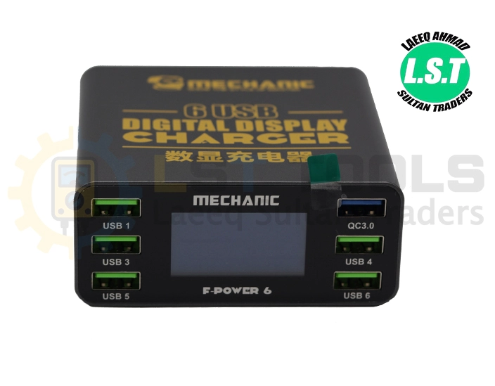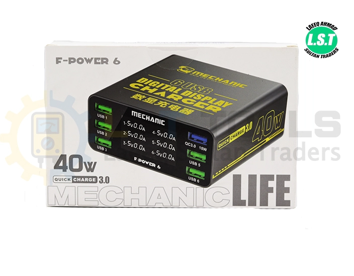 F-Power 6 MECHANIC 6 USB Digital Display Charger , With 9 Protection Quick Charge 3.0 and 18W output. Multi-port charging: It has 6 USB ports, allowing multiple devices to be charged simultaneously. 40W High Power Output: It delivers 40W of power for fast charging. Digital Display: An LED display shows real-time charging status (current/voltage). Smart Compatibility: Compatible with cell phones, tablets, and other devices. Safety Features: It has 9 levels of protection, including over-voltage, over-current, and short circuit protection. Quick Charge 3.0: Supports fast charging for compatible devices.