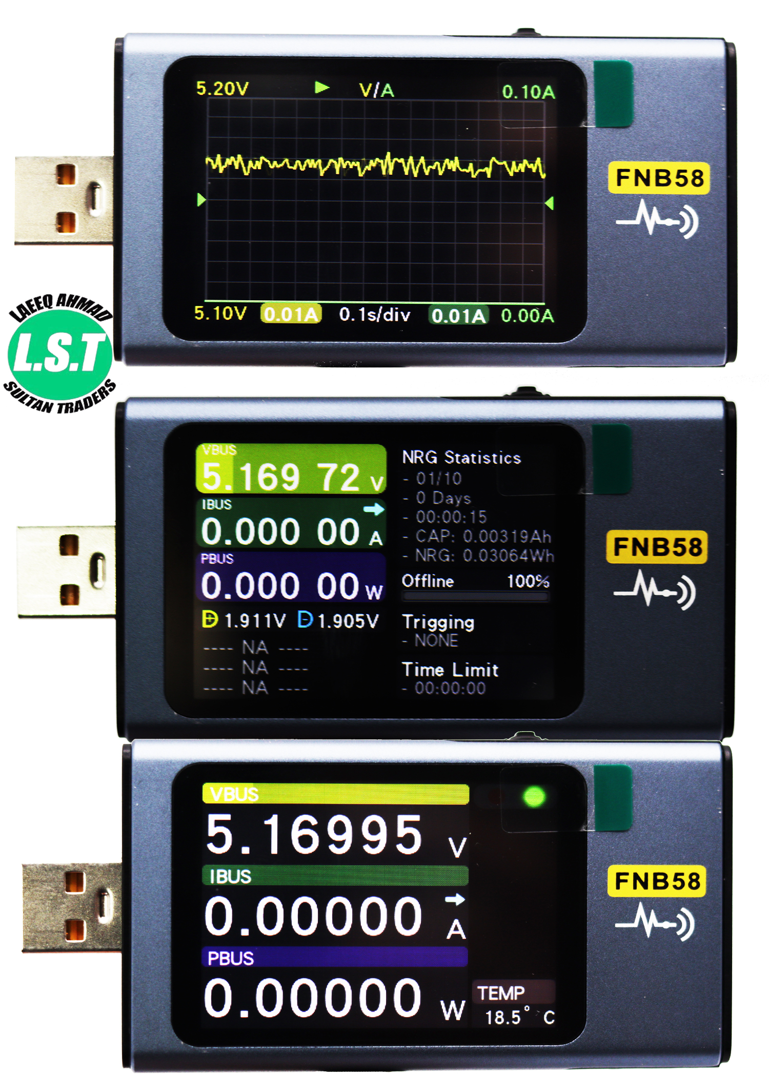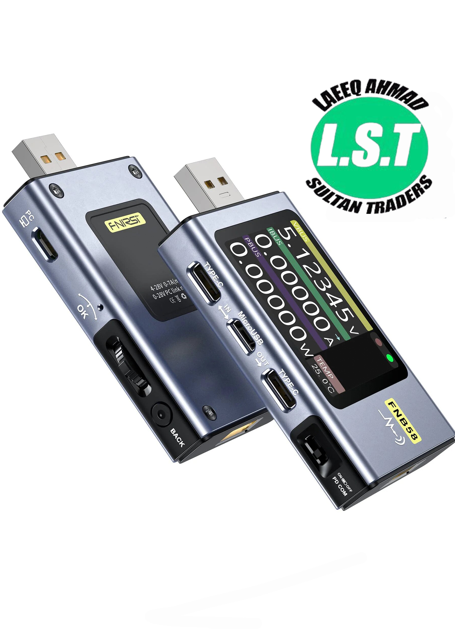 The FNB58 USB tester is a high-reliability, high-safety USB voltage andcurrent detection meter and a mobile communication terminal fast chargingtrigger.It has a 2.0-inch full-color ultra-wide viewing angle TFT LCD display, integrated USB-A, Micro-USB, Type-C interface. Use external 16-bit ADC, PD protocol physical chip. It can be used to measure the power supply or power consumption of products such as USB interfaces, mobile phone chargers, and U disks; it can be used to measure the charging power of mobile phones and the input and output of mobile power supplies; it can be used to test the fast charging protocol of chargers.