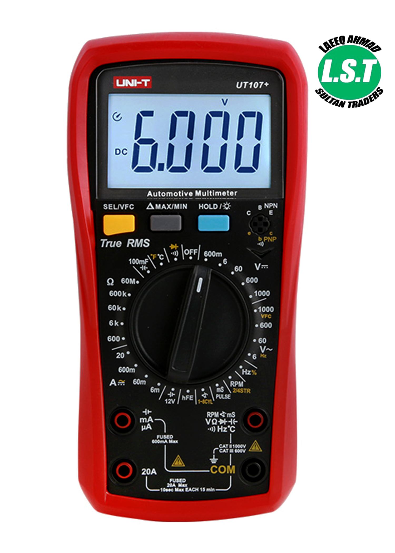 The UNI-T UT107+ is a professional automotive digital multimeter designed for vehicle diagnostics and general electrical measurements. Featuring True RMS, a 6000-count backlit display, and functions like RPM, dwell angle, pulse width, and temperature, it’s ideal for mechanics and technicians. With robust input protection, manual range selection, and support for AC/DC voltage, current, resistance, frequency, and more, the UT107+ offers reliable performance in both automotive and electrical environments
